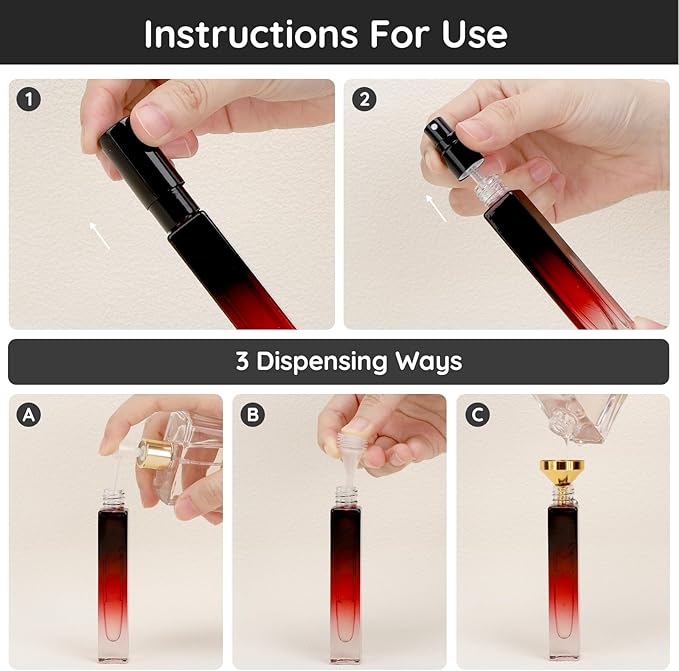 - 【Portable for Carrying】Set of 2 glass perfume bottles, each 10ML, measured 4.7x0.67in/12x1.7cm. Lightweight and portable, it is easy and convenient to store and carry out. Ideal for placing in your handbag or pocket, you could use it anytime, anywhere.