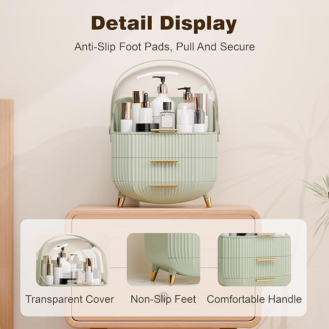Makeup Organizers and Storage, Make up Organizer for Vanity Cosmetics Skincare Organizers With Lid and Drawers Display Cases for Countertop(Light Green)