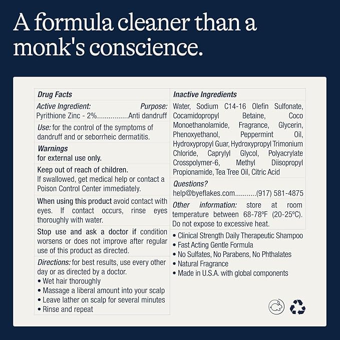 - Goodbye to Dandruff & Hello to Confidence: Drugstore brands have harsh ingredients that can irritate your scalp and make dandruff worse. Flakes shampoo for men uses 2x more of the active ingredient, pyrithione zinc, as legacy brands to get to the root cause of dandruff. Infused with MCT oil, our conditioner not only restores hair health but also adds an extra layer of dandruff defense.