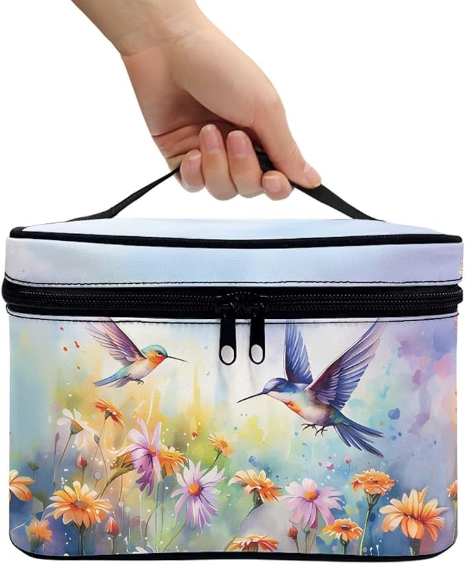 Hummingbird Vibrant Floral Pattern Travel Makeup Bag for Women Large Capacity Cosmetic Bag with Zipper and Handle Portable Toiletry Bag Make Up Organizers