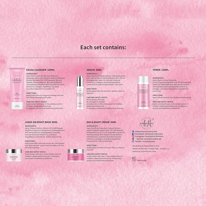 - 【Daily Skin Care Kit】This 5-piece skincare set beauty products contains our 100ml Facial Cleanser, 30ml Serum, 150ml Toner, 50ml Cream And 50ml Leave On Night Mask. This skincare bundle leaves skin looking more radiant and renewed and helps improve skin’s texture so it feels soft and smooth