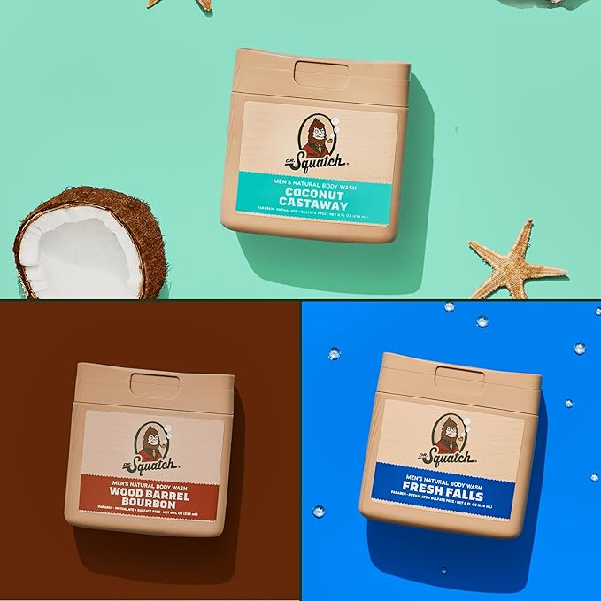 Dr. Squatch NEW Body Wash for Men with Nourishing, Natural Ingredients | No Paraben, Phthalate, Sulfate | All Day Moisturization | Wood Barrel Bourbon, Fresh Falls & Coconut Castaway (8 oz, 3-Pack)