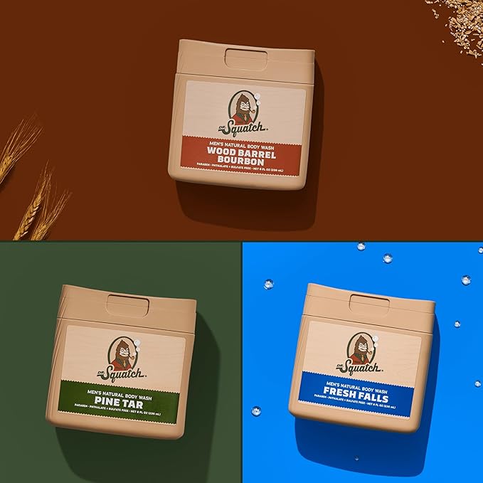 Dr. Squatch NEW Body Wash for Men with Nourishing, Natural Ingredients | No Paraben, Phthalate, Sulfate | All Day Moisturization | Pine Tar, Wood Barrel Bourbon & Fresh Falls (8 oz, 3-Pack)