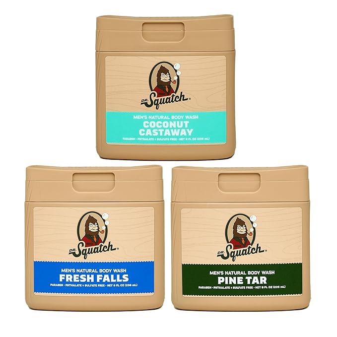Dr. Squatch NEW Body Wash for Men with Nourishing, Natural Ingredients | No Paraben, Phthalate, Sulfate | All Day Moisturization | Fresh Falls, Coconut Castaway & Pine Tar (8 oz, 3-Pack)