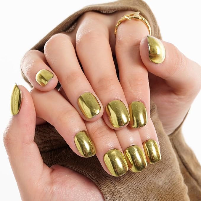GLAMERMAID Extra Short Press on Nails 24PCS, Handmade Golden Chrome Fall Gel Glue on Nails, Glossy Round Reusable UV Finish Fake Nails Acrylic False Nails Manicure Kits for Women
