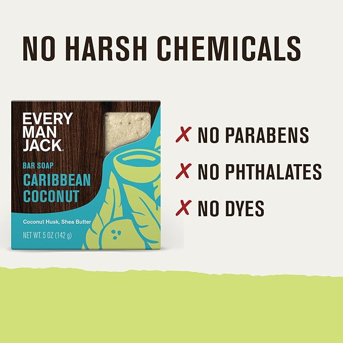 Every Man Jack Cold Processed Mens Bar Soap - Tropical Caribbean Coconut Scent - Deeply Cleans & Hydrates w/Naturally Derived Ingredients - (3 Pack)