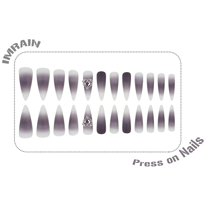 IMRAIN Press on Nails Long Stiletto Fake Nails Matte Purple Ombre Designs Full Cover Gel Artificial False Nails Cute Heart Rhinestone Charms Stick on Acrylic Nails for Women 24Pcs