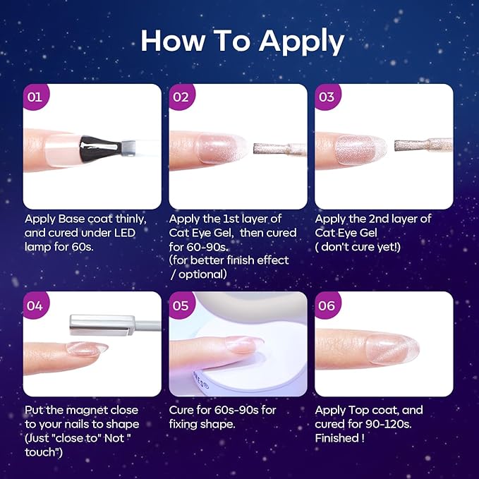 - Included Components : 3* Cat Eye Gels + 3* Galaxy Glitter Gels + 1* Doudle-heads Magnet