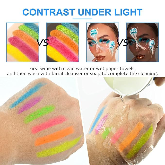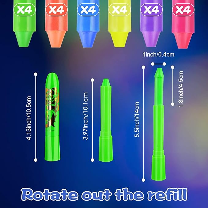 - [Easy to use and remove] :Face painting kits for kids and adults are designed to let you draw faces faster. The face crayon has a contortable design that can be twisted and adjusted to fit your body or face. Fluorescent paint is easy to remove outside, just wipe your skin with regular makeup remover wipes, which can save you time and effort.