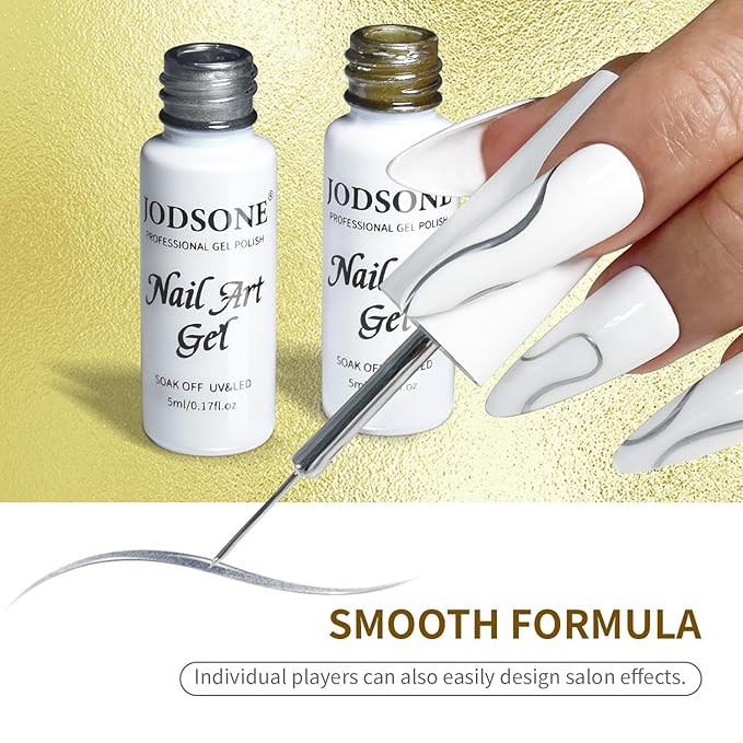 JODSONE 2pcs Metallic Nail Art Gel Liner Gold Mirror Chrome and Silvery 3D Effect Gel Nail Polish Thin Brush Metal Painted DIY at Home Salon Quality Gift for Women
