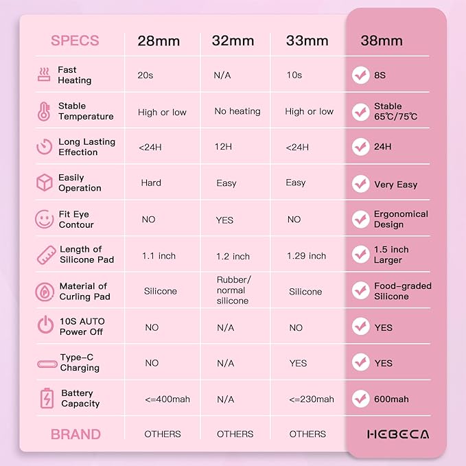 - The Lash Lifesaver for the Modern Ladies: HEBECA professional heated eyelashes curler features with Innovative Food-graded Silicone Pad, 2 Curling TEMPERATURE Setting, Precise Temperature Control, Engonmic Design for Safe and Easily use. please only notice that girls who small eyes or too short eyelashes will be not suitable to choose