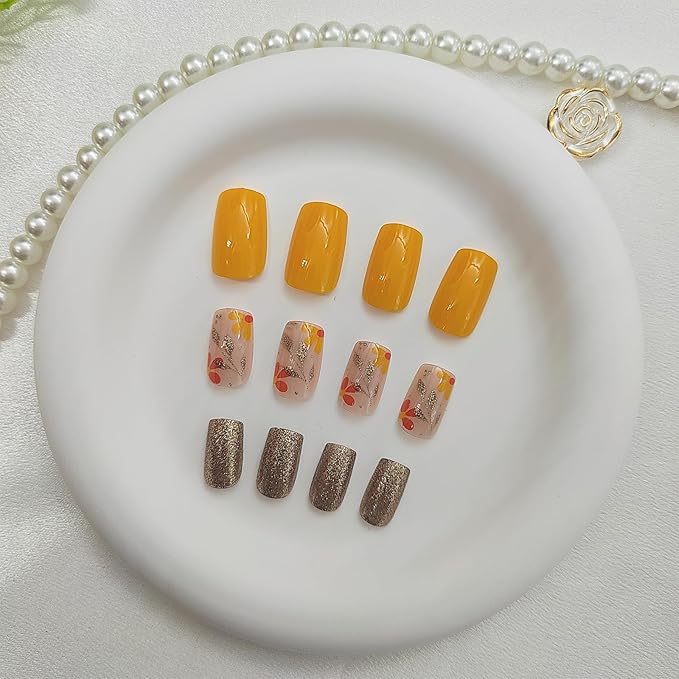 Square Press on Nails Medium False Nails with Glitter Leaves Flower Designs Yellow Fake Nails Glitter Nails Press ons Glossy Glue on Nails Fall Artificial Orange Stick on Nails for Women 24Pcs