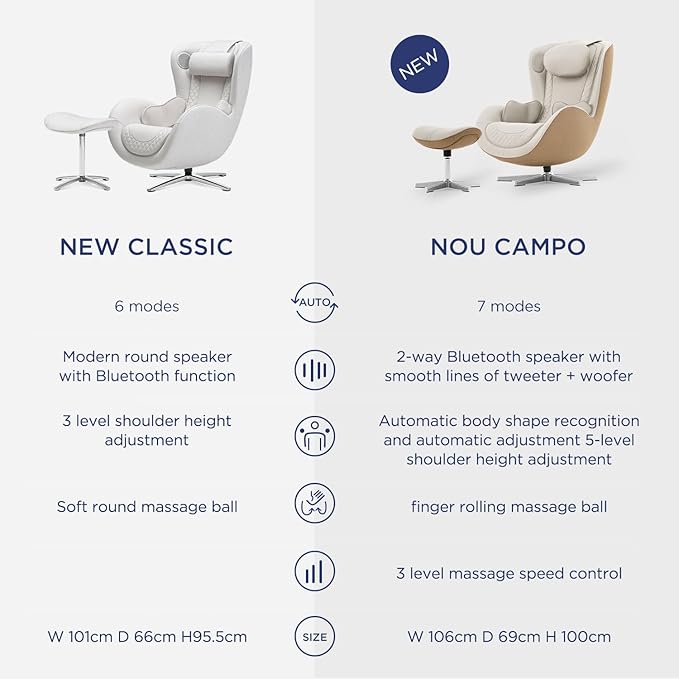 - 【Award-Winning Design】: The Nou Campo massage chair builds on the classic, Red Dot Award-winning design, offering enhanced comfort and style. Now 5cm wider, 3cm deeper, 4.5cm taller, and with an expanded headrest compared to the New Classic, it provides a spacious relaxation experience tailored for users up to 190 cm tall and 120 kg in weight. This sleek, everyday chair integrates advanced 'big massage chair' technology, delivering luxurious curved massages, effortless tilting, and 90-degree rotation. Elevate both your comfort and your living space with this sophisticated, larger-sized massage chair.