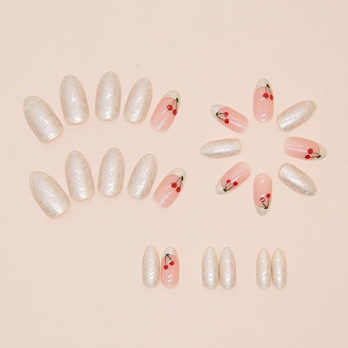 Almond Press-on Nails - Medium French Tips, Pink Glossy Full Cover Nails, 24 PCS/Set (Pink Cherry)