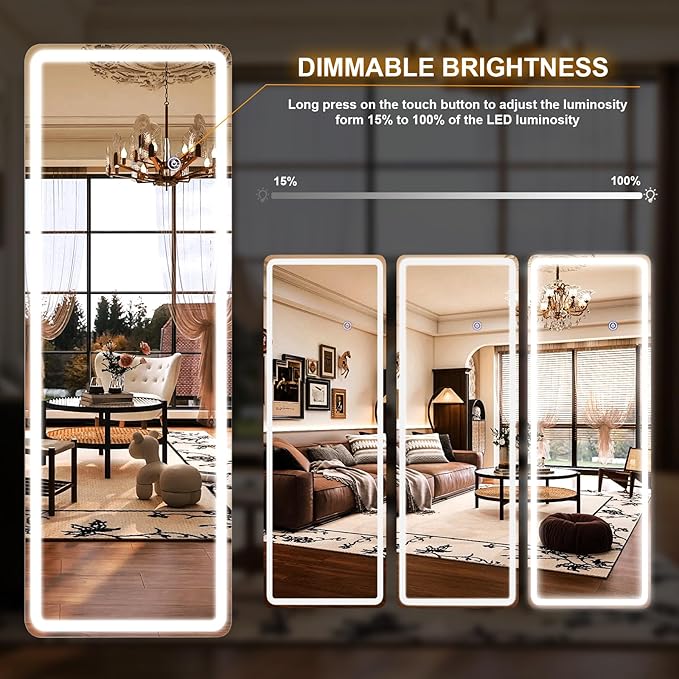 - High-Definition Mirror: This HD LED full-length mirror features a high-precision mirror surface, providing a clear, distortion-free reflection from head to toe. Every detail is accurately displayed, allowing you to check your appearance with precision and confidence. The built-in LED lighting enhances brightness and clarity, simulating different lighting conditions to help you achieve your best look in any environment