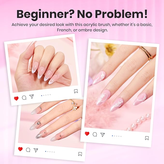 - Material: Round-shaped acrylic brushes for nails is made from 50% kolinsky hair. Bristles is dense and flexible, highly absorbent. Effectively dipped in acrylic powder, easy to apply and shape. Anti-shedding tube secures every bristle. Ensure long-lasting durability