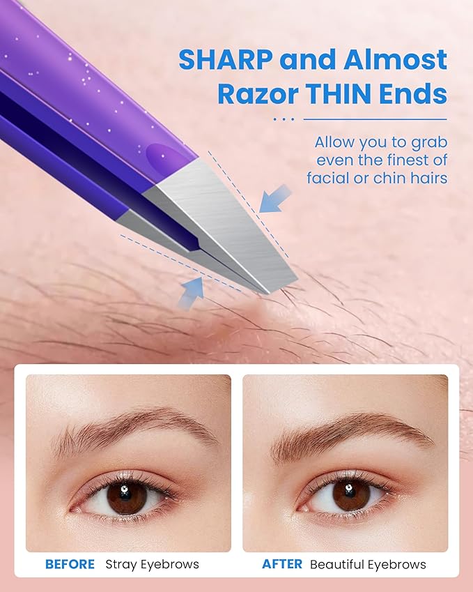 - 【Sharp SLANT TIPS for Every Hair】25° slanted tip is the perfect angle for removing unwanted hair. These ultra-fine tips grip the tiniest hairs effortlessly - from peach fuzz to stubborn chin hairs. Unlike flimsy tweezers, our professional-grade design removes hairs cleanly without breakage. Perfect for women's facial hair care routines and men's grooming kits alike.