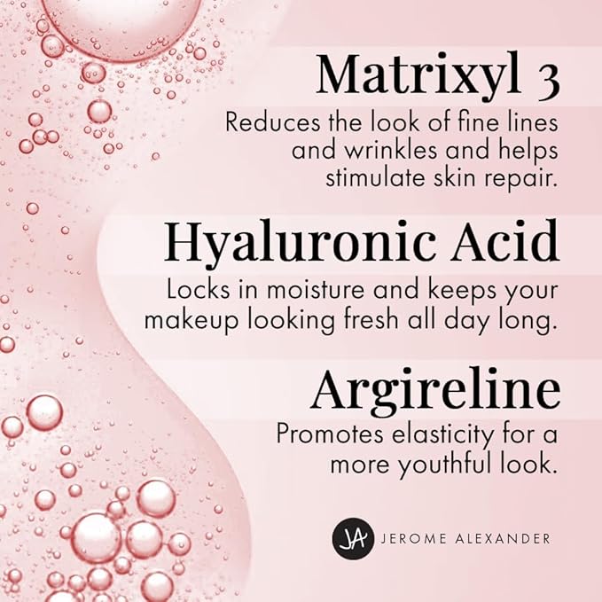 - Argireline and Matrixyl 3000: Reduces lines and wrinkles, relaxes wrinkles, boosts collagen production, elasticity, and stimulates skin repair.