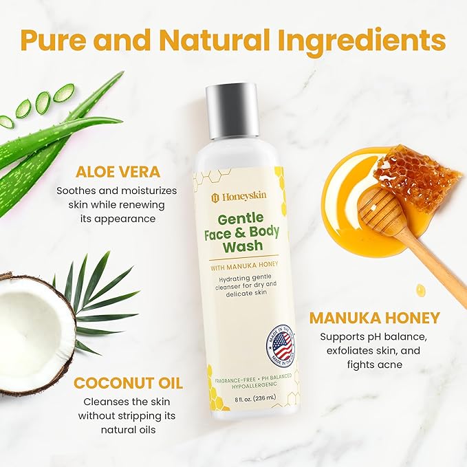 - GENTLE, DEEP CLEANSING FACE AND BODY WASH - Honeyskin organic body wash & gentle face cleanser for dry skin gently yet thoroughly cleanses skin without stripping out natural oils, leaving skin feeling clean, soft, & healthy. This cleanser face wash also helps soothe & calm dry, itchy, or irritated skin.