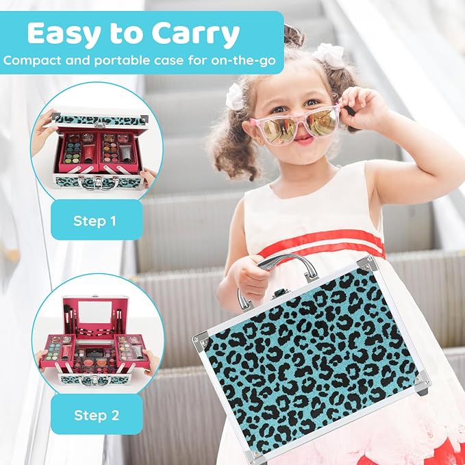 - All-In-One Teen Makeup Kit: Includes 7* eyeshadow palette (28 colors), 5* lip balm palette (20 colors), 2* blush, 4* eyeshadow cream, pink glitter gel, silver glitter gel, 8* brushes, eyeliner, lipstick, mirror, leopard cosmetic bag, and a tag, all neatly packed in a stylish makeup case