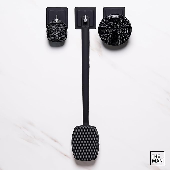 The Man Scrub Box - Silicone Back Scrubber, Face Scrubber & Body Scrubber Cleansing Brush for Men, Storage Hooks - Shower Bathroom Accessories for Men - Gifts for Him, Silicone Scrubbers Gift Box