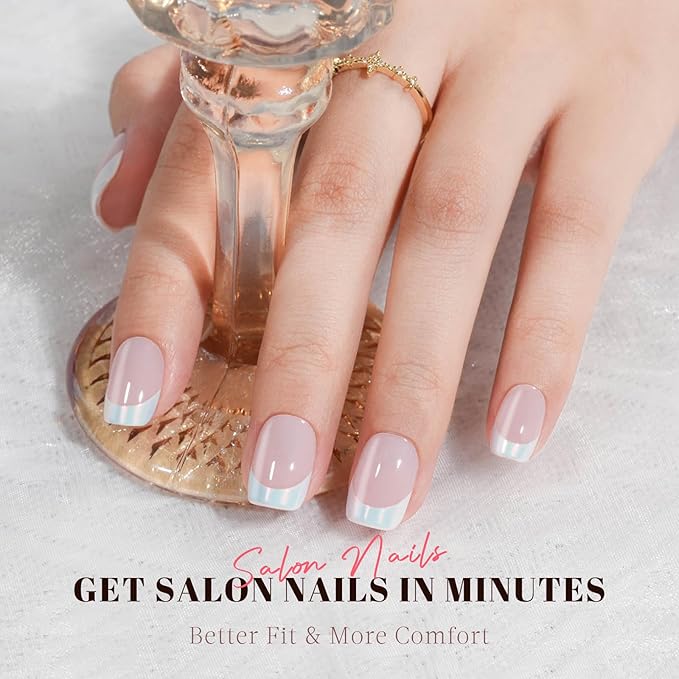 - 【Get Salon Nails in Minutes】This press-on nail kit contains 32 pcs false nails in 16 sizes. Our short french tip press on nails are made with a handmade process using gel polish for a natural look. You can get salon-like nails in just 10 minutes. NOTE: THIS KIT DOES NOT COME WITH GLUE, ONLY PRESS-ON NAILS