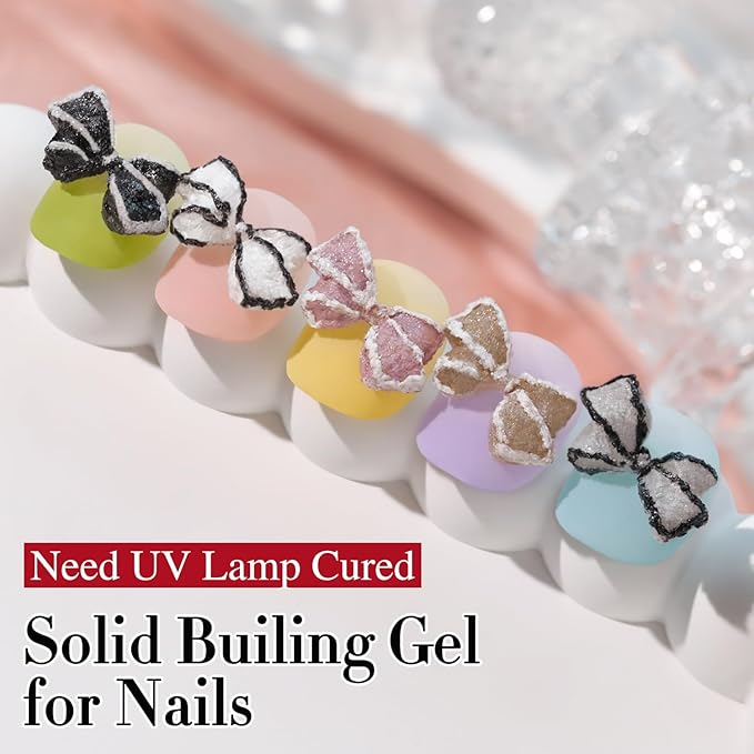 - Multifunctional Solid Building Gel: This solid building hard gel can be used for nail extensions, sculpting,carving, nail designs and stick decoration. It can also be used to apply gel tips and large nail charms/jewels as well as to make charms in silicone molds. Soft material can be kneaded into any shape or other decoration, allowing you to create various 3D nails art.