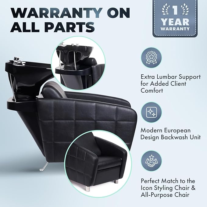 - ππππππ ππππππππ ππππππ: Features sleek black vinyl with quilted embroidery on the arms and detailed stitching for a sophisticated finish. The Icon Backwash Unit brings both style and professionalism to any salon or barbershop interior.