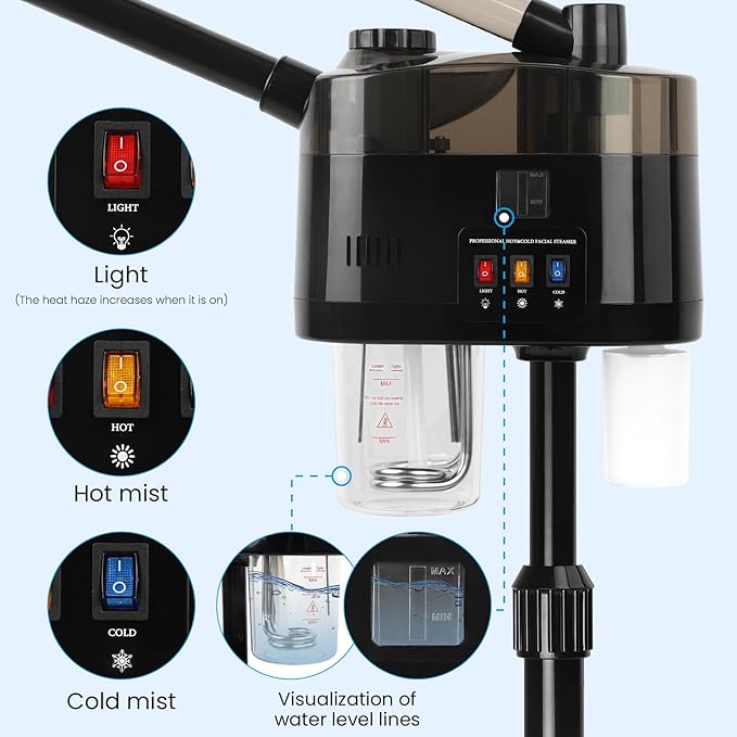 - 【Safe and Reliable】This professional facial steamer for estheticians has an auto off feature that stops the machine when it is tilted 25°/ when the water volume is below or above the water level line for safety.