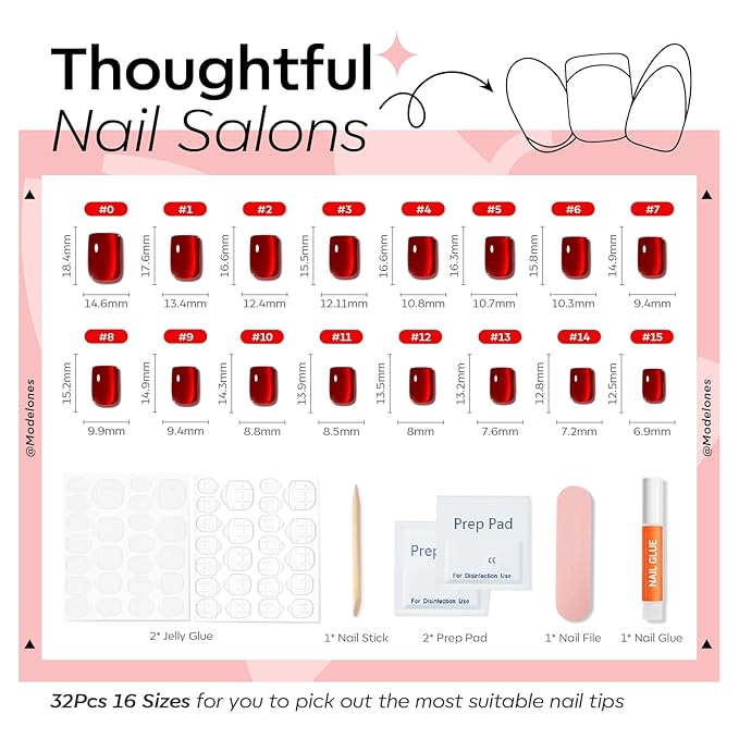 - 32 pcs Nails in 16 Sizes: The press on nails kit comes with 32pcs fake nails in 16 different sizes to suit each finger, each set comes complete with a nail glue, 2 sheets jelly adhesive tabs, double-sided nail file, cuticle stick, and prep pad