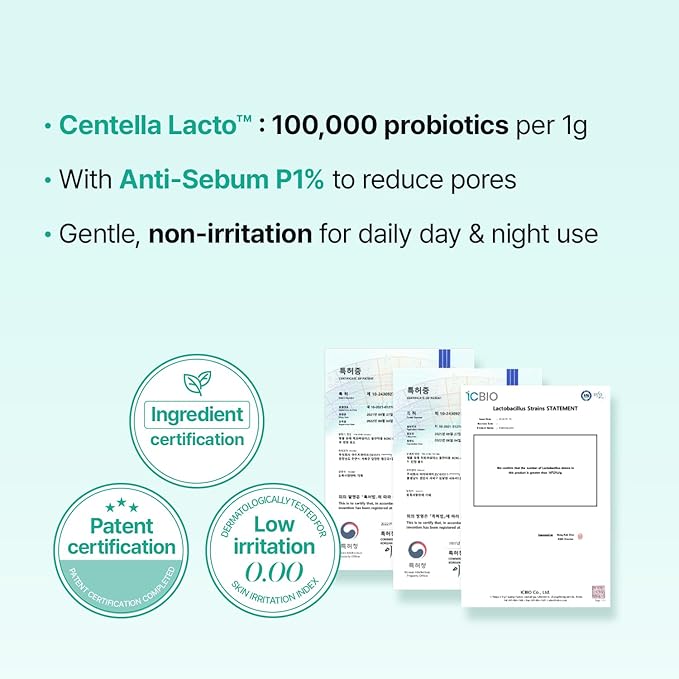 - [π PATENTED INGREDIENTS FOR PORE REFINEMENT π] Features Bifida to refine pore structure, Niacinamide to enhance skin texture, and patented Centella Lacto to balance your skin microbiome and reinforce the skin barrier for long-term health.