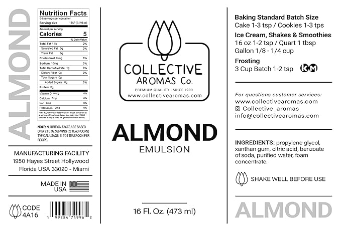 Almond Emulsion for Baking β Natural Flavoring Blend for Cookies, Cakes, Ice Cream, Smoothies, Beverages & More β 16 fl oz Kosher, Pure Almond Emulsion by Collective Aromas Co.