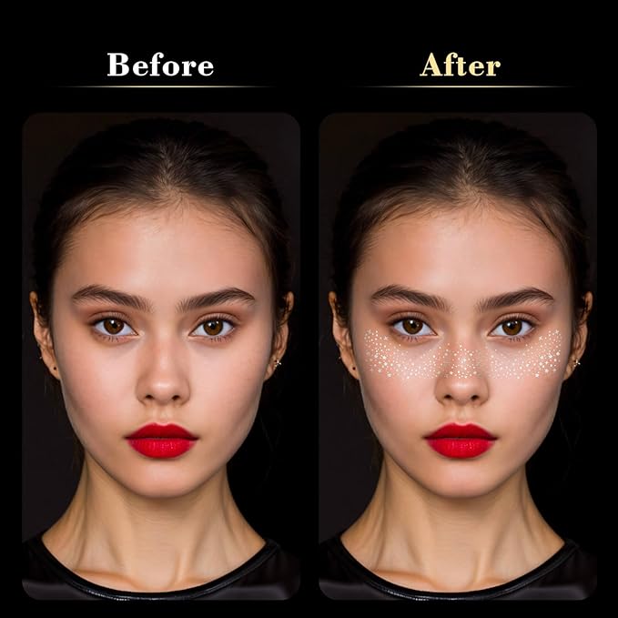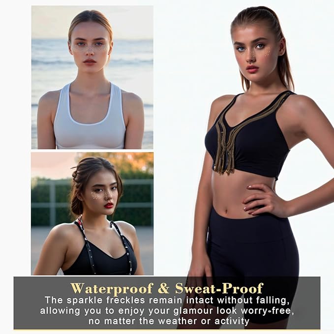 - Waterproof & Sweatproof:Our sparkle freckles are designed to stay in place, even through sweat, rain, or long days at music festivals and parties.The waterproof formula ensures that your sparkly freckles remain intact without smudging or fading, allowing you to enjoy your radiant look worry-free, no matter the weather or activity.