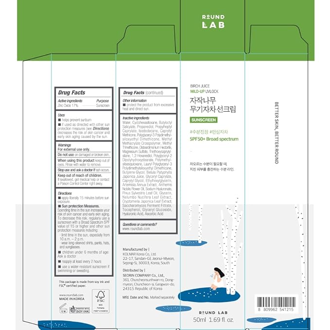 ROUND LAB Birch Juice Mild-up Sunscreen UV LOCK 1.69 Fl Oz | SPF 50+ broad spectrum, Mineral Zinc Oxide, for Sensitive Skin, Control Oil and Sebum, Korean Sunscreen