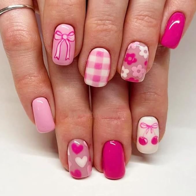 - Easy to Use: Flowers press on nails just choose the nail piece that suits you,polish the nail bed,stick the jelly glue we give away on your nails,then press the short Squoval fake nails on the nails for 30 seconds to get the shiny manicure that girls love