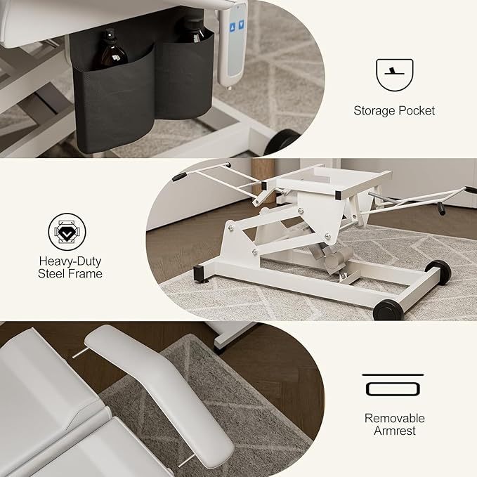 - Electric Remote Adjustment: One-touch control of the height by remote control. The powerful motor can smoothly lift the esthetician bed. The backrest and leg cushion have an manual adjustment range of 0-60°and 0-45°respectively. Can lay flatly. Used in various beauty projects
