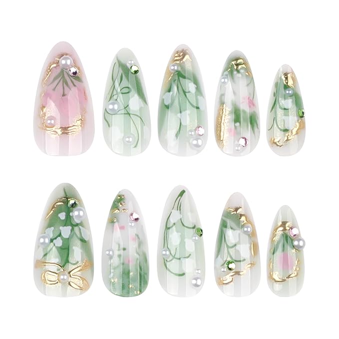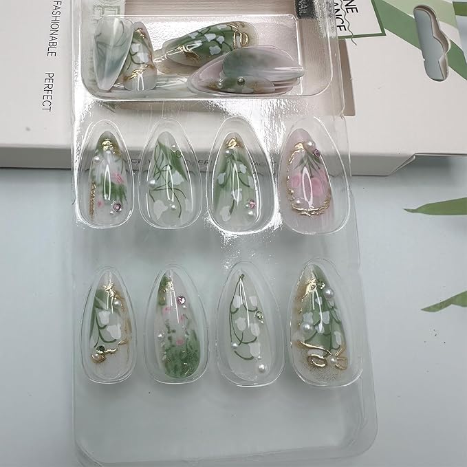- Package Contains:You will get 24 Pcs green flower fake nails with design press on nails in 12 sizes, 1 nail file and 24 jelly glues,1 small wooden stick.