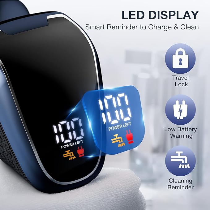 - LED Smart Display: The built-in LED display clearly shows the battery level, so you always know when it’s time to recharge. It also features smart reminders for low battery and cleaning, making the shaver more user-friendly