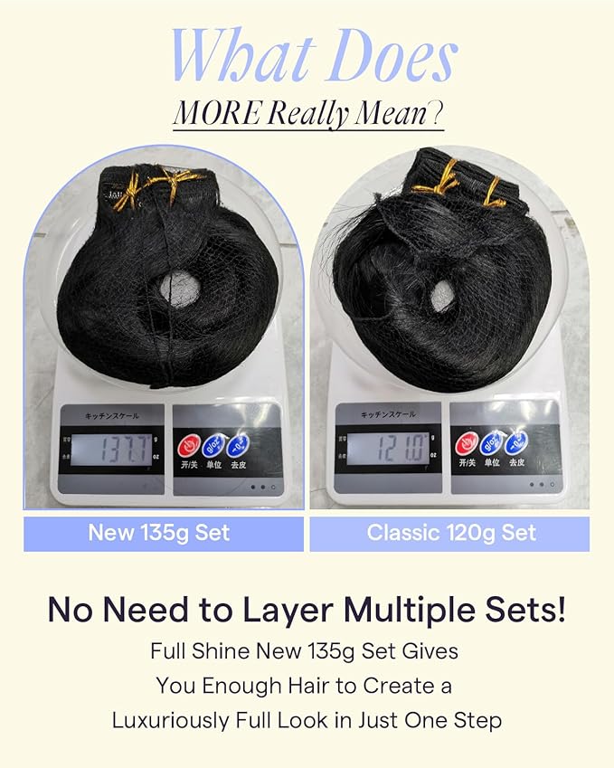 - Thicker Volume for Dramatic Effect: Full Shine upgraded 135g design provides significantly more hair than standard 120g sets. Achieve the thick, luxurious volume required for a stunning, dramatic Jet Black look from root to tip. Strategically designed to add the perfect amount of body to fine or medium hair, providing a dense, non-bulky finish essential for dark hair