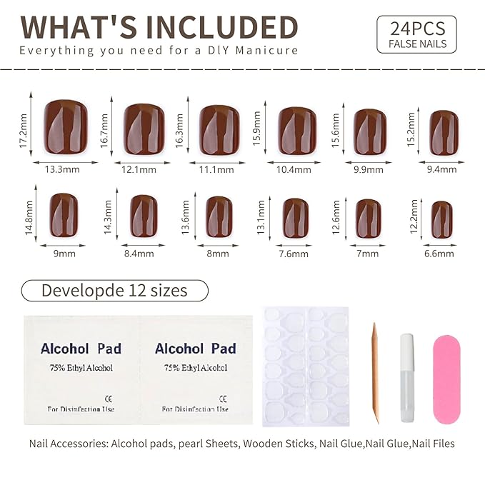 - Package Includes: 30 pcs stick on false glue on nails kit, each box includes 30 brown press on nails, 1 sheet of 30 sticky nail pieces, 1 cuticle stick, 1 double sided nail file and gel press on nails cleaning pads, a small tube of nail glue,All the tools you need to apply the nails are included in one set