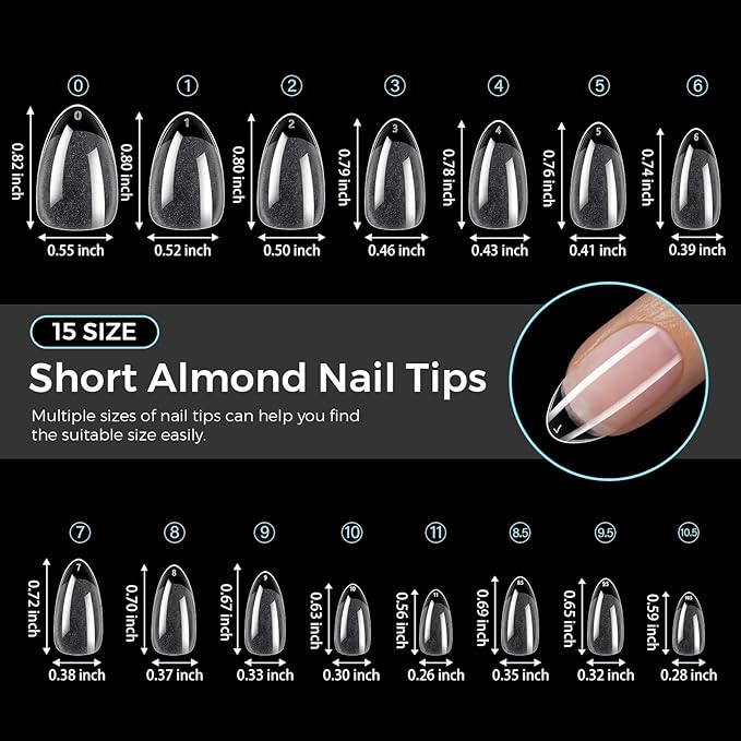 - 【Easy to Use】Our almond nails collection includes 240pcs in 12 standard + 3 sizes, accommodating flat/curved nail beds with precision. Each clear nail tips short almond is numbered. Achieve <0.5mm gap perfection for extra short almond nail tips or dramatic stiletto conversions.
