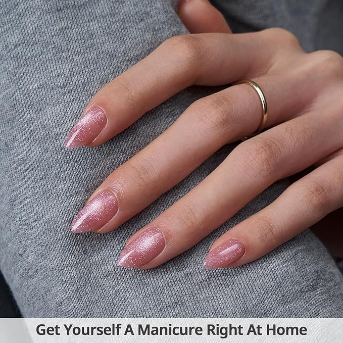 BTArtbox Press On Nails Short - Lamp-Curable Pink Cat Eye Almond Press On Nails with Glue for Women, Semi-Transparent Soft Gel Glue On Nails in 16 Sizes - 32 Stick On Nails Kit, Spring Charm