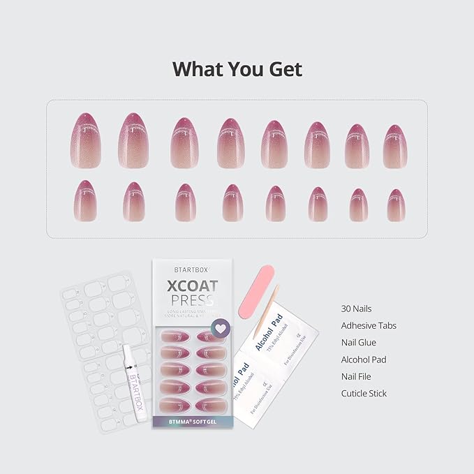 BTArtbox Almond Press On Nails Medium - Lamp-Curable Pink Cat Eye Press On Nails with Glue for Women, Semi-Transparent Soft Gel Glue On Nails in 15 Sizes - 30 Stick On Nails Kit, Rosy Dew