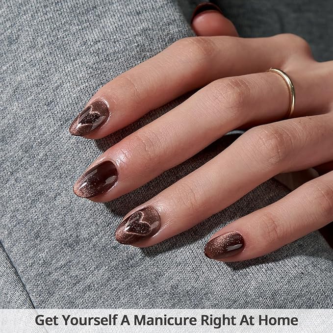 BTArtbox Extra Short Almond Press On Nails - Brown Cat Eye Press On Nails with Glue for Women, Opaque Soft Gel Glue On Nails in 16 Sizes - 32 Stick On Nails Kit, Heart Coffee Art