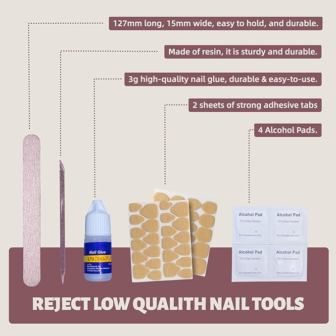 - 【All-In-One Application Kit Included】 Comes complete with 3g strong nail glue, 12.7cm nail file, crystal cuticle stick, 2 ultra-adhesive sticker sheets (1 large + 1 small), and 4 alcohol prep pads—everything you need in one box.