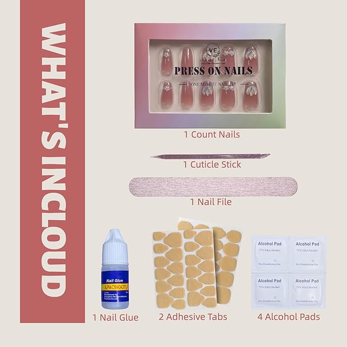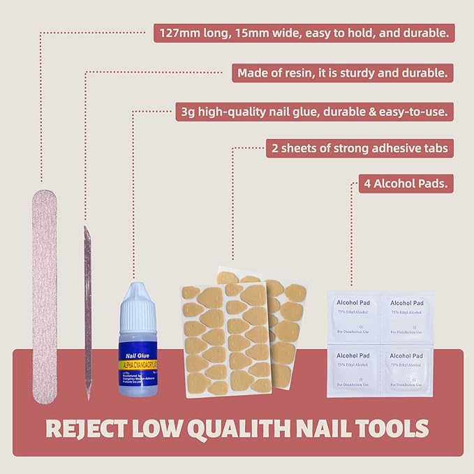 - Complete Nail Kit for Easy Application: Your purchase comes with a 12.7cm nail file, 3g strong nail glue, two sizes of ultra-adhesive tabs, 4 alcohol pads, and a cuticle stick—everything you need for quick, professional stick on nails at home.