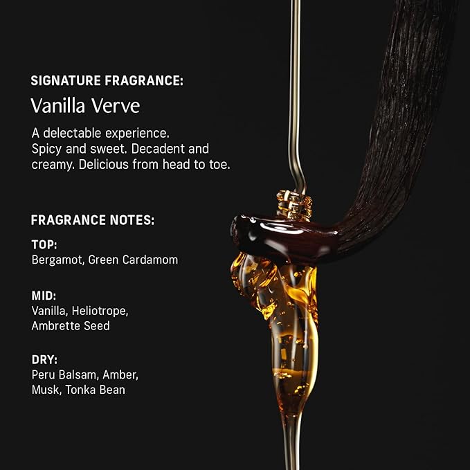 - VANILLA VERVE: Vanilla, bergamot, amber, and Peru balsam create a harmonious balance of creamy sweetness, citrus brightness, and warmth. We formulated Vanilla Verve for a shower experience that’s spicy, sweet, and creamy.