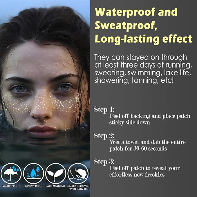 - 【Easy of Application】: Applying our facial glitter speckle patches is effortless! Remove the backing clear sheet by peeling it off; Apply the sticky side to your skin; Dab the entire patch with a wet sponge or towel; After 30-60 seconds, gently remove the backing paper;