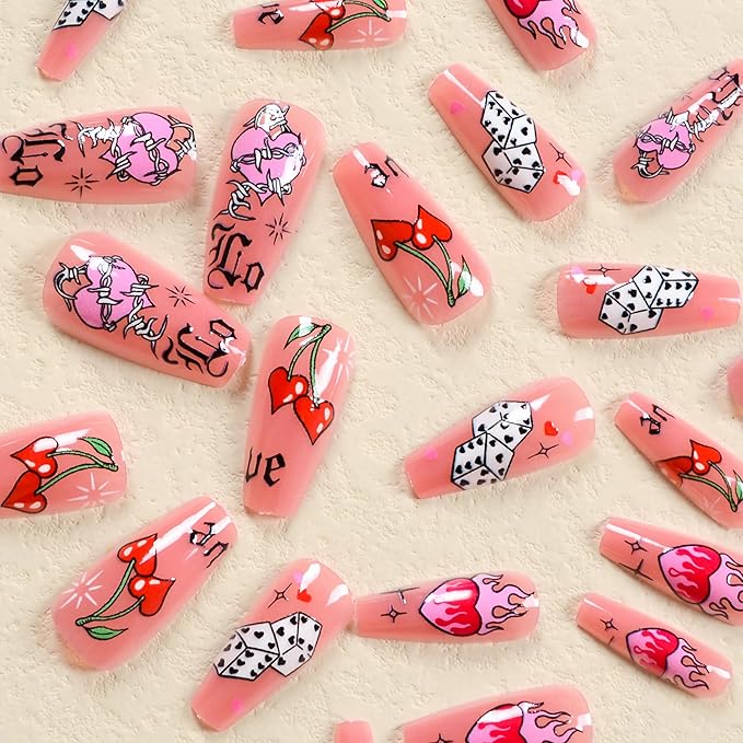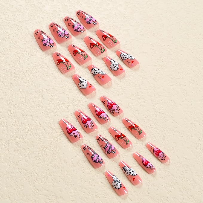 BABALAL Press on Nails Long Coffin Fake Nails Pink Heart Glue on Nails Valentine Day Dice Arcylic Nails 24Pcs Manicure False Nails Ballerina Stick on Nails Glossy Artificial Nails