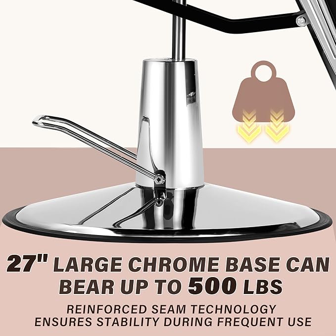 - HYDRAULIC HEAVY DUTY BARBER CHAIR: Sturdy steel frame, 27-inch large chrome polished base, load-bearing capacity up to 440 pounds, equipped with a 6.5-inch adjustable hydraulic pump, durable.